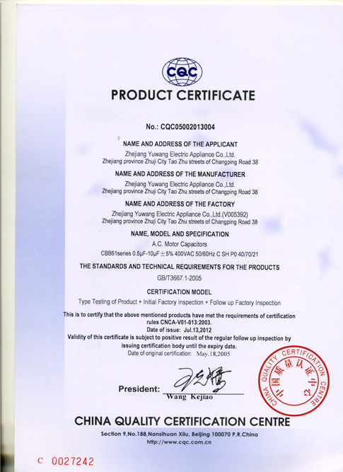 CQC证书 CBB61 0.5μF—10μF 400V 40/70/21 (英文)