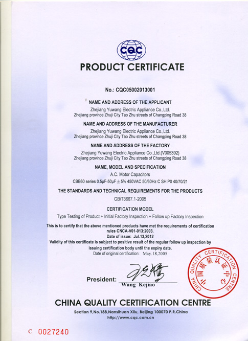 CQC证书 CBB60 0.5μF—50μF 450V 40/70/21 (英文)